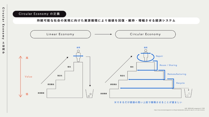 2019年より、スタートアップ~大企業までサーキュラーエコノミー事業創出のコンサルティングや教育プログラムを企画・実施。また、全国の自治体にてサーキュラーエコノミーによる街づくりサーキュラーシティの取組みを推進。